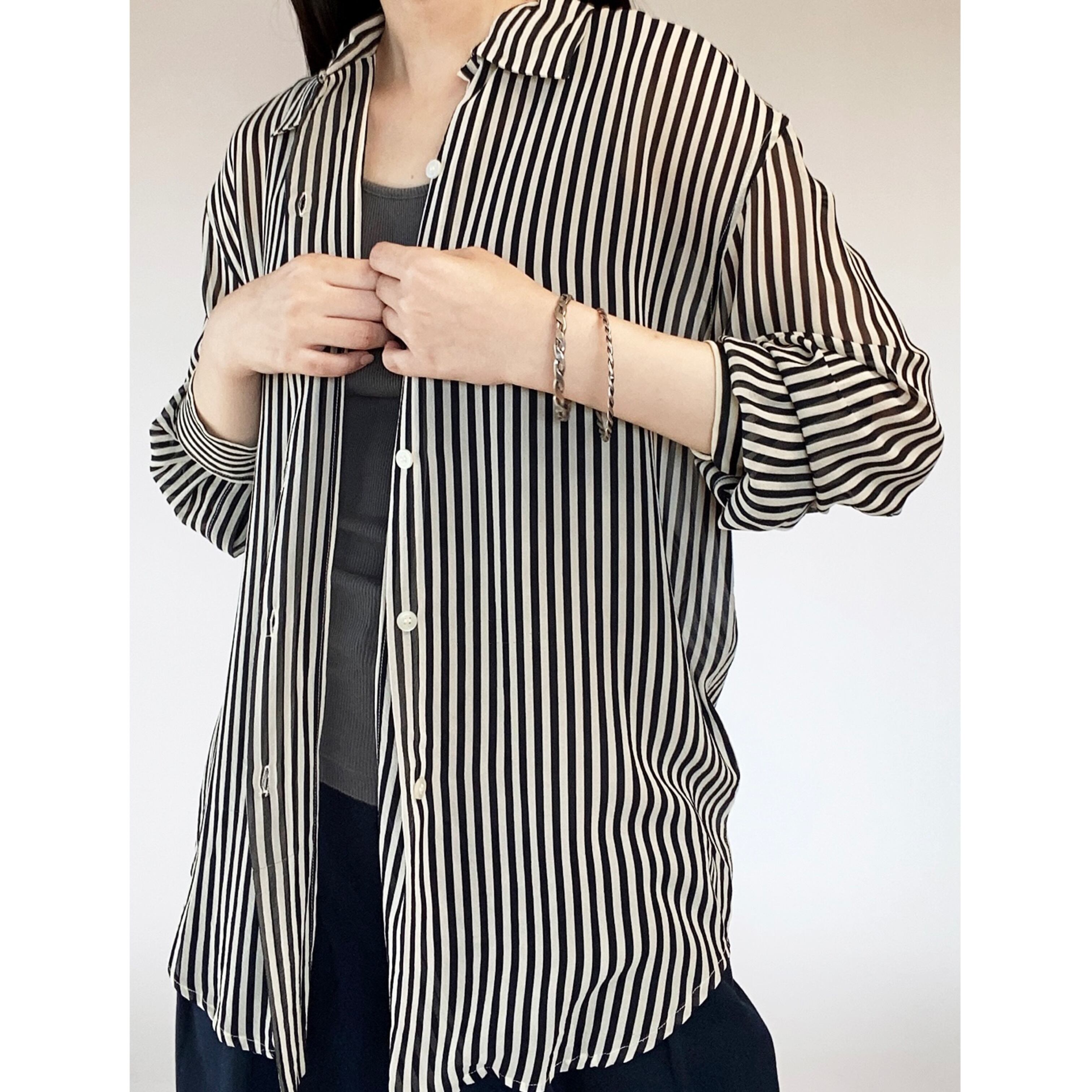 ストライプのシアーシャツは透け感があり